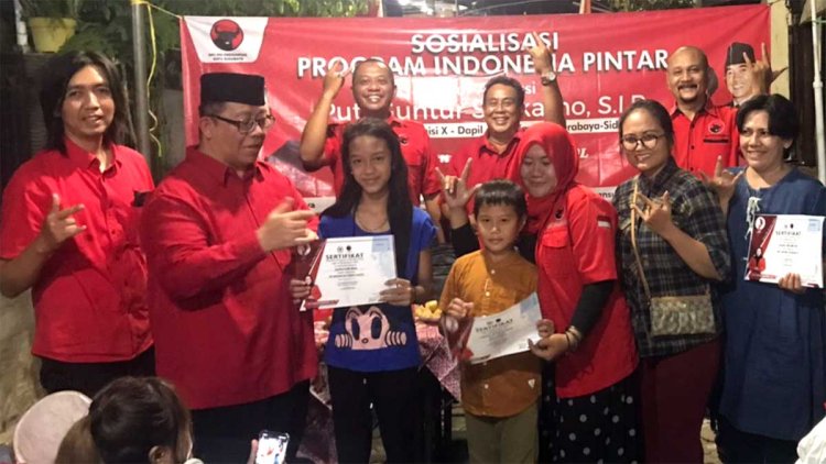 Kegiatan pembagian sertifikat PIP bagi anak-anak SD dan SMP di wilayah Sukomanunggal dihadiri Plt Ketua DPC PDIP Surabaya Yordan M Batara Goa, Wakil Ketua DPC Sukadar serta Aliyudin, tenaga ahli DPR RI Puti Guntur Soekarno, atau Mbak Puti.