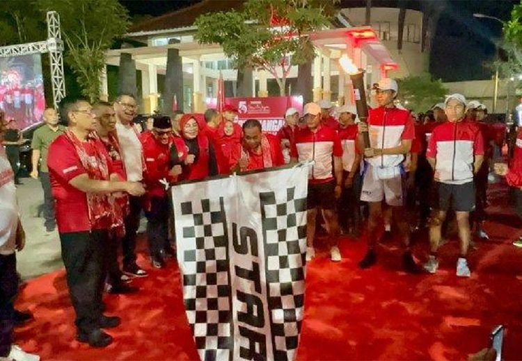 GROBOGAN – DPP Partai Demokrasi Indonesia Perjuangan melepas pelari pembawa obor perjuangan yang bersumber dari Api Abadi Mrapen, Kabupaten Grobogan, Jawa Tengah, Jumat (17/5/2024).