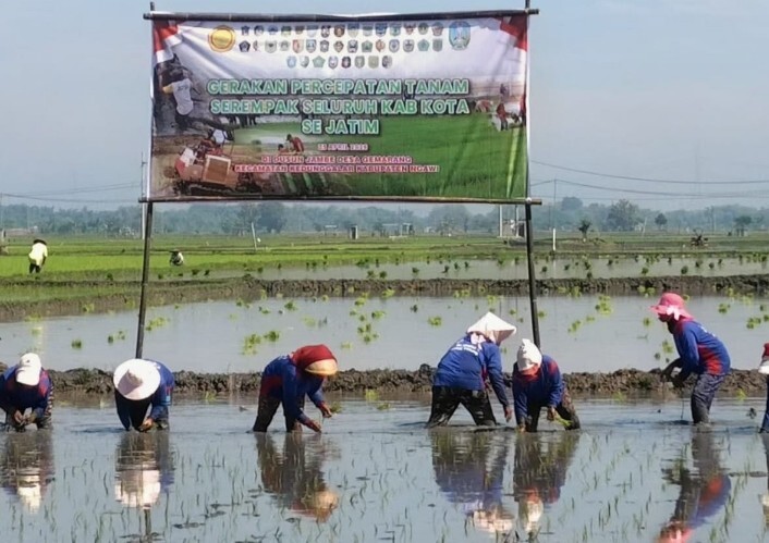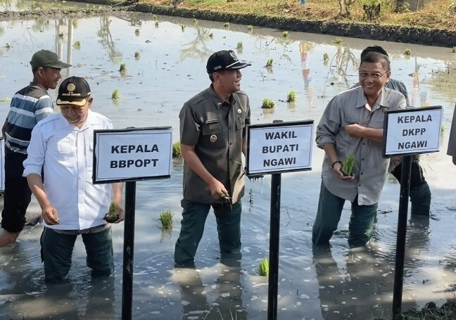 Hal itu disampaikan Wakil Bupati Ngawi, Dwi Rianto Jatmiko di sela acara Gerakan Percepatan Tanam Padi Serempak se-Jatim di Desa Gemarang, Kecamatan Kedunggalar, Kabupaten Ngawi, Kamis (23/4/2026).