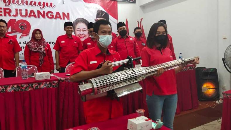 LAMONGAN – Ketua DPD PDI Perjuangan Provinsi Jawa Timur, Kusnadi SH MHum menyerahkan 5 (lima) unit alat fogging kepada pengurus DPC Lamongan. Alat penyemprot tersebut sebagai sarana untuk membasmi nyamuk penyebab penyakit demam berdarah dengue (DBD).