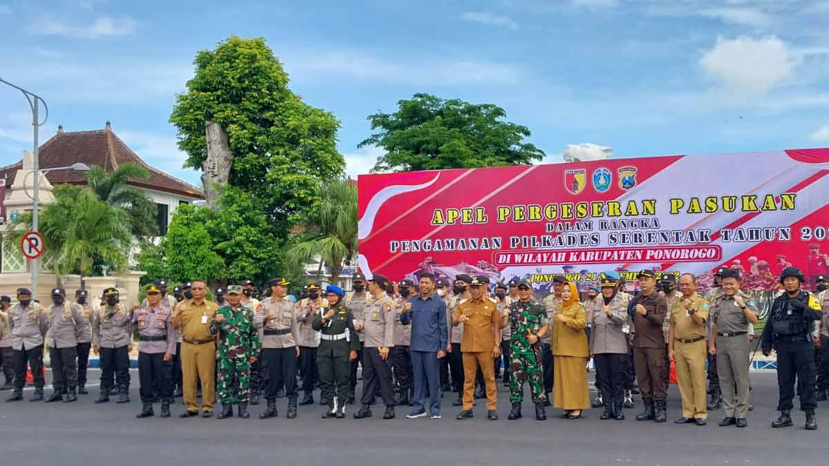 PONOROGO – Menjelang pemilihan kepala desa (pilkades) yang akan diselenggerakan pada 22 November 2022 di wilayah Kabupaten Ponorogo, Pemerintah Kabupaten (Pemkab) Ponorogo mengadakan Apel Pergeseran Pasukan di depan Paseban Alun-Alun Ponorogo, Senin (21/11/2022).