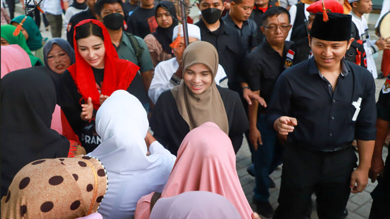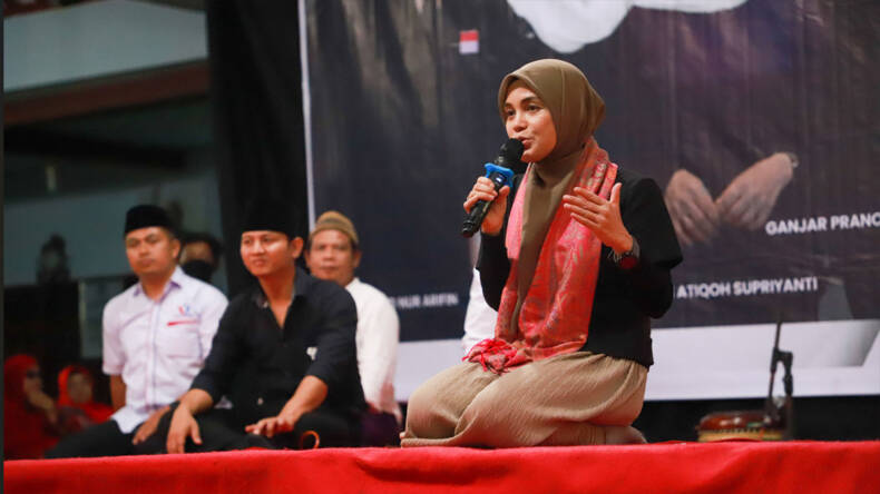TRENGGALEK – Istri calon presiden nomor urut 3 Ganjar Pranowo, Hj Siti Atikoh Supriyanti bersilaturahmi ke Pondok Pesantren Qomarul Hidayah, Gondang, Kecamatan Tugu, Kabupaten Trenggalek, Senin (18/12/2023) sore.