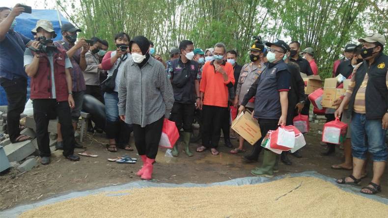GRESIK – Menteri Sosial Tri Rismaharini mengunjungi warga Gresik selatan yang menjadi korban banjir luapan Kali Lamong, Minggu (7/11/2021).