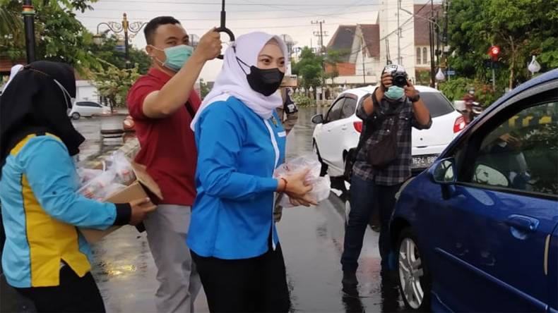 MADIUN – Wakil Wali Kota Inda Raya bersama Komite Nasional Pemuda Indonesia (KNPI) Kota Madiun membagikan 350 paket takjil kepada masyarakat yang melintas di depan kantor Bakorwil Madiun, Jumat (29/4/2022).