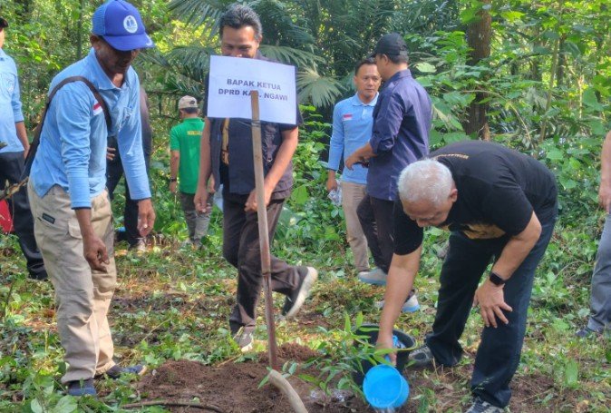 NGAWI – Tiga pilar partai di Kabupaten Ngawi menanam pohon untuk memperingati Bulan Bhakti Bung Karno tahun 2025. Lokasi tanam pohon dilaksanakan di lereng Lawu Utara, masuk wilayah Jogorogo, Minggu (15/6/2025).