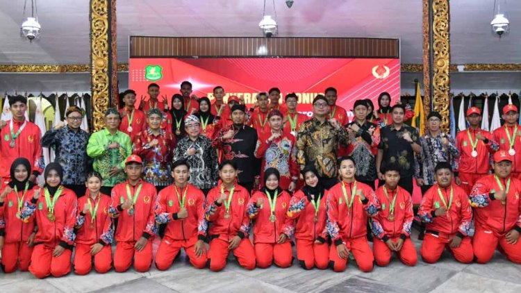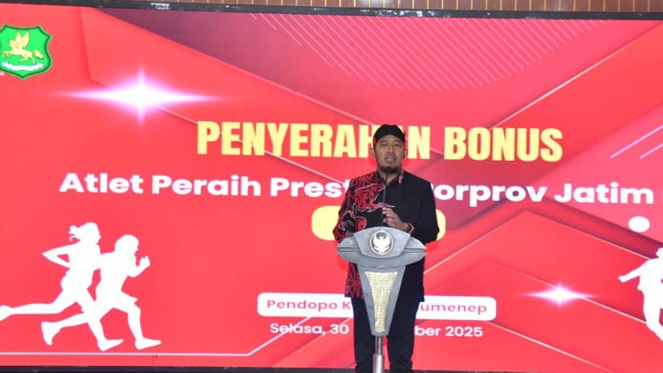 SUMENEP – Bupati Sumenep, Achmad Fauzi Wongsojudo, menyerahkan bonus untuk atlet peraih medali Pekan Olahraga Provinsi (Porprov) Jawa Timur 2025 di Pendopo Keraton Sumenep, Selasa (30/9/2025) malam.