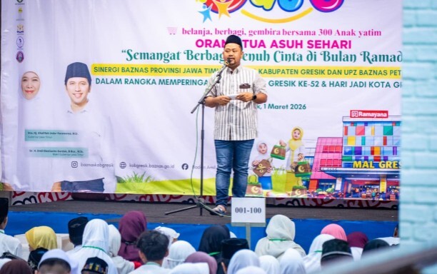 GRESIK – Bupati Gresik Fandi Akhmad Yani menjadi orang tua asuh anak yatim sehari dan menemani mereka belanja baju lebaran di salah satu pusat perbelanjaan Mal Gresik, Minggu 1 Maret 2026.