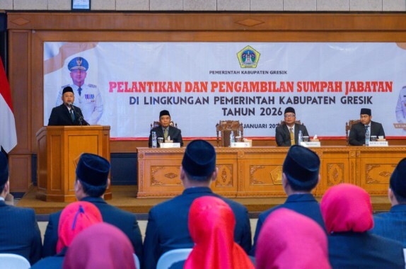 GRESIK – Bupati Gresik Fandi Akhmad Yani mengambil sumpah dan melantik 55 kepala sekolah serta 21 pejabat fungsional di lingkungan Pemerintah Kabupaten Gresik. Pelantikan tersebut berlangsung di Ruang Mandala Bhakti Praja, Kantor Bupati Gresik, pada Senin 5 Januari 2026.