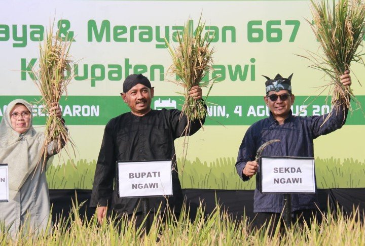 Di petak lahan sawah masuk Desa Jambangan, Bupati Ony bersama dengan sejumlah unsur Forkopimda Ngawi memetik padi dengan sabit. Padi yang yang telah menguning itu hanya diambil segenggam tangan. Itu menjadi penanda bahwa masa panen segera tiba.