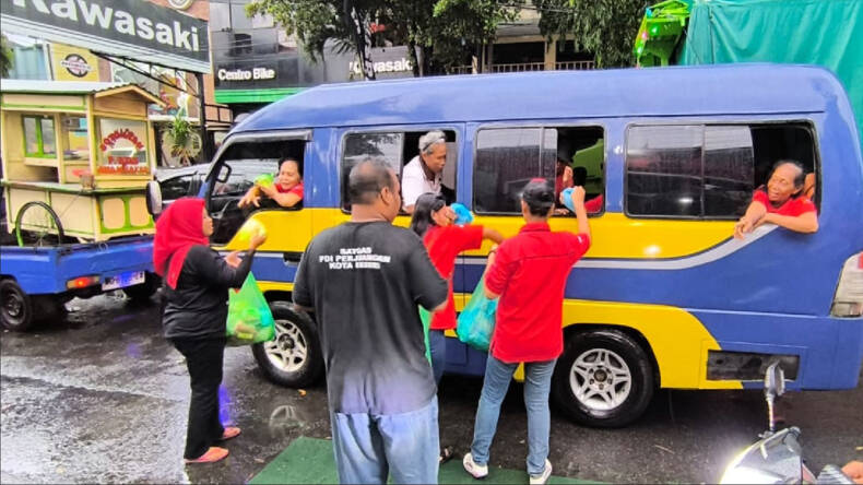 Mereka tampak gembira dan bersemangat membagikan makanan dan minuman pembuka puasa ke para pengguna jalan.