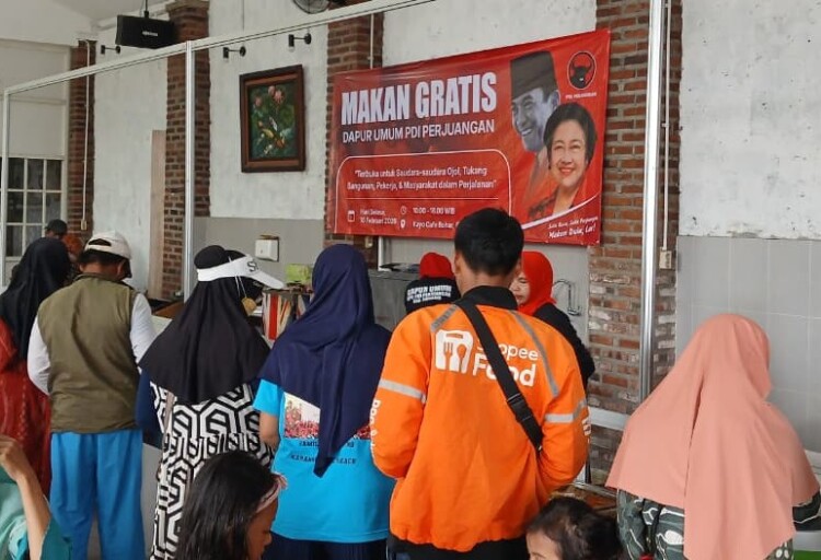 Ratusan orang, mulai dari pengemudi ojek daring, kurir logistik, hingga sopir truk, tampak sabar menunggu giliran mengambil hidangan prasmanan di warung yang hari ini “disulap” menjadi Dapur Umum DPC PDI Perjuangan Sidoarjo.
