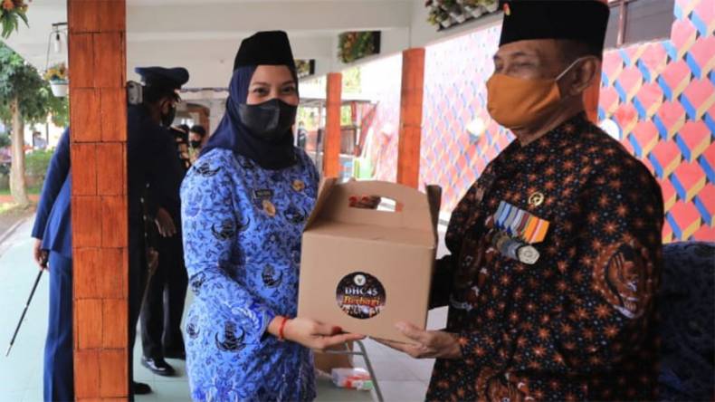 Sementara itu, Wakil Wali Kota Madiun Inda Raya menyerahkan santunan sosial setelah selesai upacara Peringatan Hari Pahlawan di halaman Balai Kota Madiun.