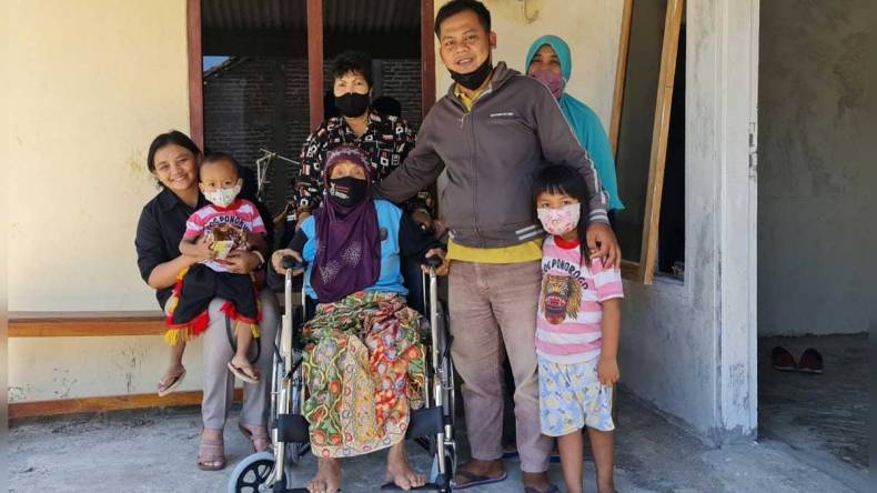 “Wis sui banget ora ndelok njobo, nek ngene iso lungguh karo momong putu (sudah lama sekali tidak melihat suasana luar rumah, kalau begini bisa duduk sambil momong cucu),” ujarnya dengan nada girang sambil mencoba duduk di atas kursi roda barunya di teras rumah.
