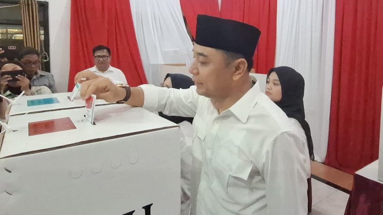 SURABAYA – Calon Wali Kota Surabaya, Eri Cahyadi, turut mencoblos Pilkada 2024 di TPS 4 Jl. Ketintang Permai Blok BF no. 11, Karah Surabaya, Rabu (27/11/2024).
