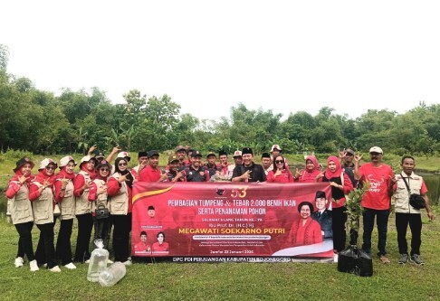BOJONEGORO – Masih dalam rangkaian memperingati Hari Ulang Tahun (HUT) ke-53 PDI Perjuangan sekaligus Hari Ulang Tahun Ketua Umum PDI Perjuangan, Prof. Dr. (H.C.) Hj. Megawati Soekarnoputri, DPC PDI Perjuangan Kabupaten Bojonegoro menggelar kegiatan penanaman pohon, tebar benih ikan, serta pembagian tumpeng kepada masyarakat, Jumat (23/1/2026).