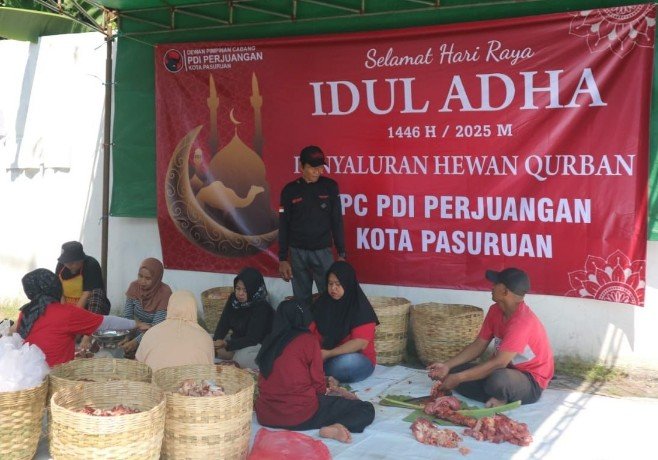 Penyembelihan dilaksanakan di rumah potong hewan. Sementara pembagian daging kurban di Kantor DPC PDI Perjuangan Kota Pasuruan yang berlokasi di Jalan KH. Mas Mansyur, Kelurahan Sekargadung, Kecamatan Purworejo, Sabtu (7/6/2025).