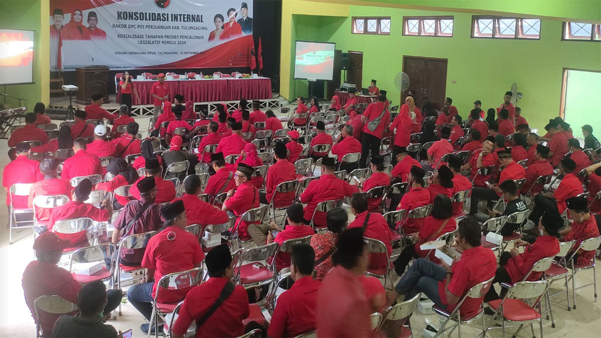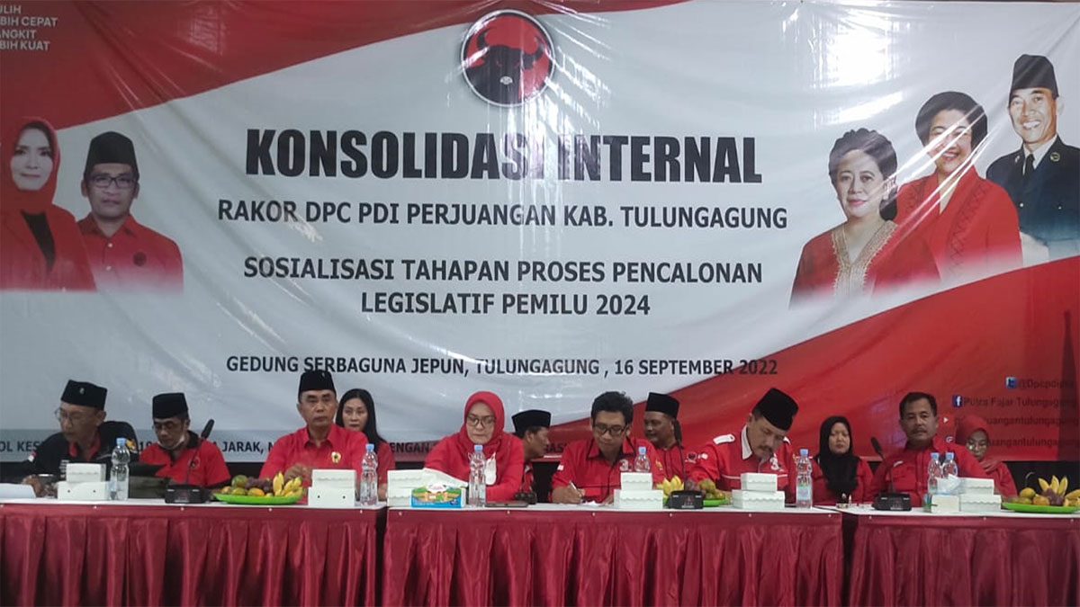 TULUNGAGUNG – DPC PDI Perjuangan Kabupaten Tulungagung menggelar rapat koordinasi (rakor) sosialisasi tahapan proses pencalonan anggota legislatif (caleg) Pemilu 2024 di Gedung Serbaguna Jepun, Jumat (17/9/2022) sore.