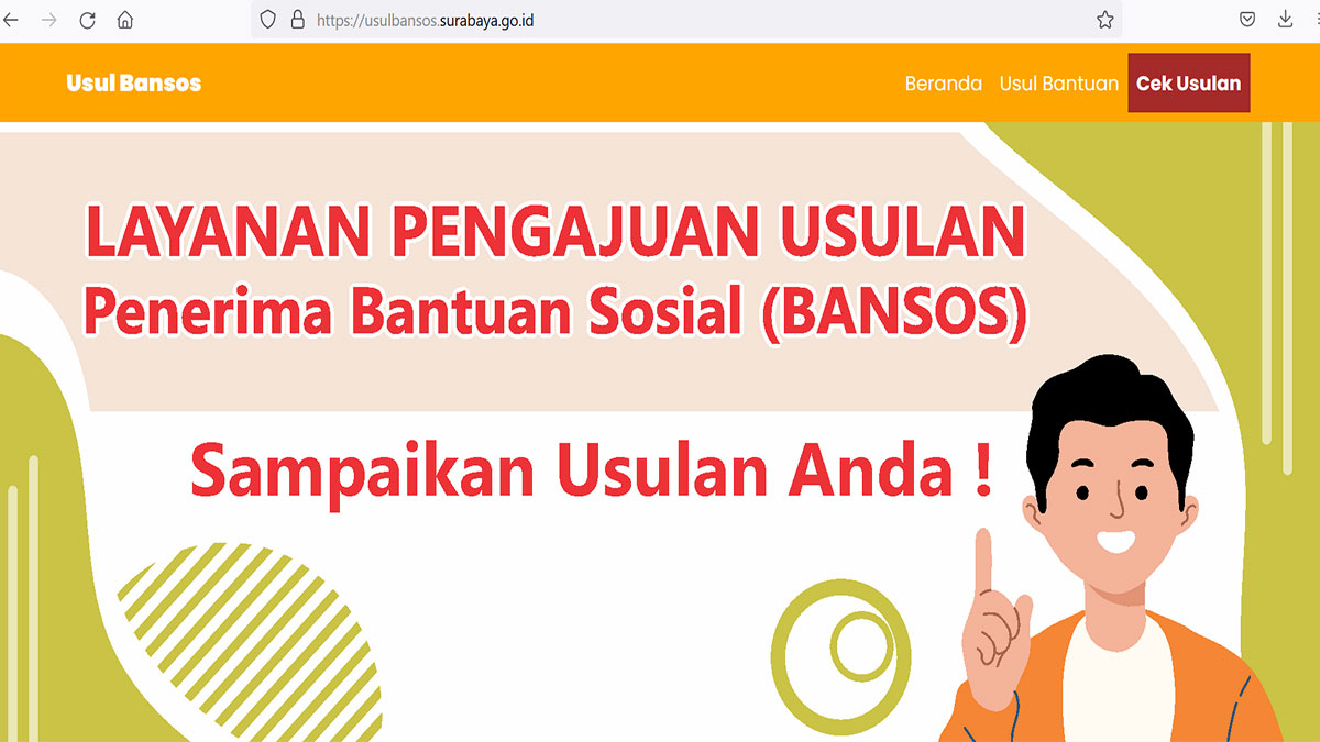 Cukup masuk ke laman: https://usulbansos.surabaya.go.id/ lalu akan muncul layanan pengajuan usulan penerima bantuan sosial (bansos). Selanjutnya, bisa digeser ke bawah untuk mengisi form usulan penerima bantuan.
