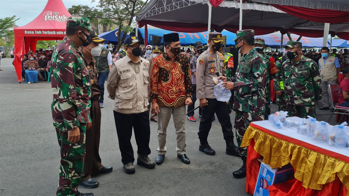 Dalam gelaran Serbuan Vaksinasi Covid-19 di GOR Lembupeteng hari ini, Minggu (18/7/2021), Bupati Maryoto bersama Kolonel Inf Waris Ari Nugroho dan Forkopimda Tulungagung sempat memberikan masker gratis pada warga yang antre vaksinasi dan memberikan bantuan paket sembako secara simbolis. (atu/pr)