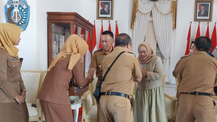PONOROGO – Hari pertama pascalibur Lebaran, para Aparatur Sipil Negara (ASN) di lingkungan Pemerintah Kabupaten (Pemkab) Ponorogo menggelar halal bihalal di Rumah Dinas Bupati (Pringgitan) Ponorogo, pada Selasa (8/4/2025).