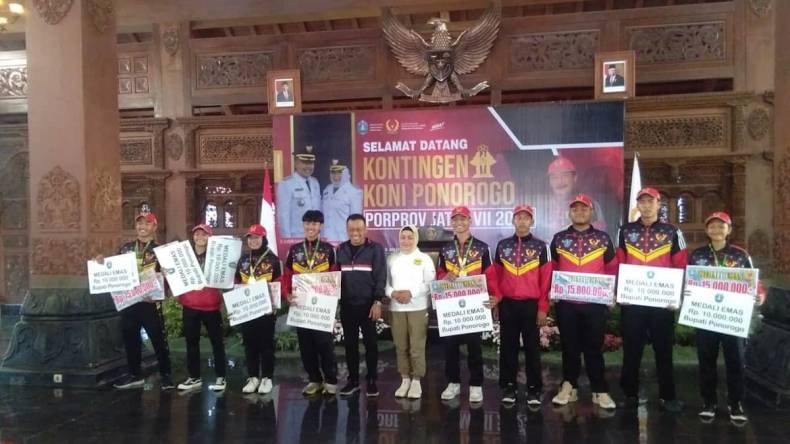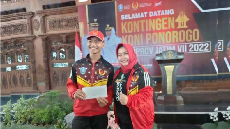 PONOROGO – Para atlet asal Ponorogo menorehkan prestasinya di ajang Pekan Olahraga Provinsi (Porprov) VII Jawa Timur 2022 dengan menyabet 9 emas, 5 perak, dan 15 perunggu dari berbagai cabang olahraga (cabor). Untuk itu, Pemerintah Kabupaten (Pemkab) Ponorogo mengganjar mereka bonus. Peraih medali emas mendapatkan Rp15 juta, perak mendapatkan Rp7,5 juta, dan perunggu mendapatkan Rp 3,5 juta.