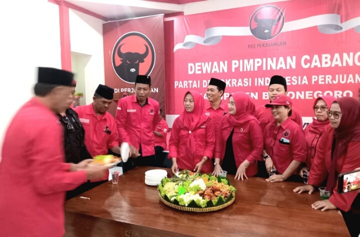 ​Acara diakhiri dengan pemotongan tumpeng bersama di aula kantor DPC sebagai simbol rasa syukur dan kebersamaan antar kader.(dian/hs)