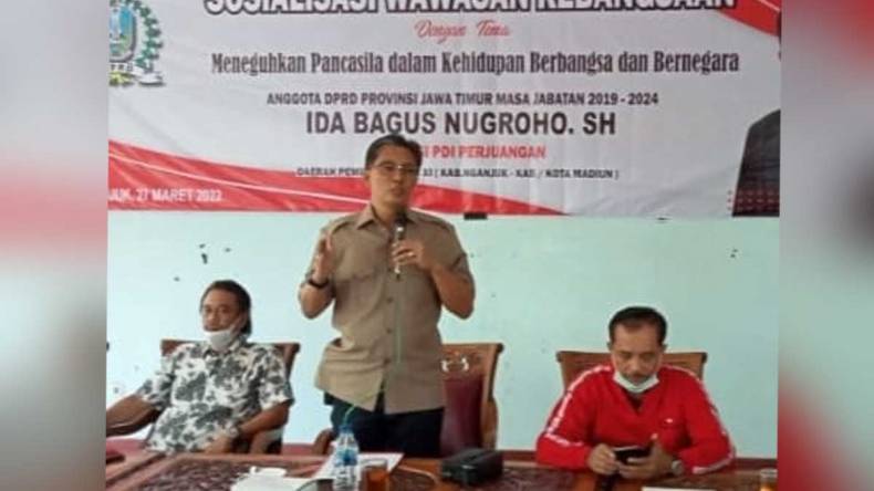NGANJUK – Anggota DPRD Jawa Timur, Ida Bagus Nugroho SH sosialisasi wawasan kebangsaan kepada warga masyarakat di Kertosono, Nganjuk, Minggu (27/3/2022).