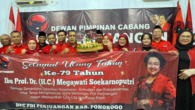 PONOROGO – DPC PDI Perjuangan Kabupaten Ponorogo menggelar acara syukuran dalam rangka memperingati Hari Ulang Tahun (HUT) ke-79 Ketua Umum PDI Perjuangan, Megawati Soekarnoputri. Kegiatan tersebut berlangsung di Kantor DPC PDI Perjuangan Ponorogo, Jalan Budi Utomo Nomor 10, Kelurahan Ronowijayan, Kecamatan Kota, Jumat (23/1/2026).