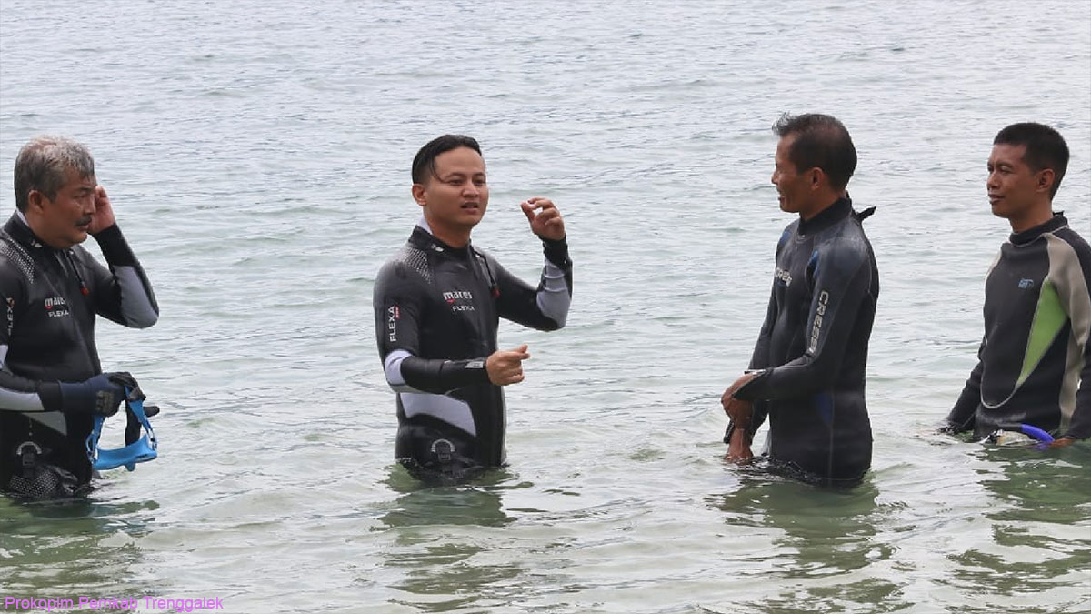 TRENGGALEK – Bupati Trenggalek, Mochamad Nur Arifin (Mas Ipin) mengawali penanaman terumbu karang menggunakan metode Bioreeftek Cinta dengan menyelam di Pantai Mutiara, Desa Tasikmadu Kecamatan Watulimo, Rabu (8/2/2023).