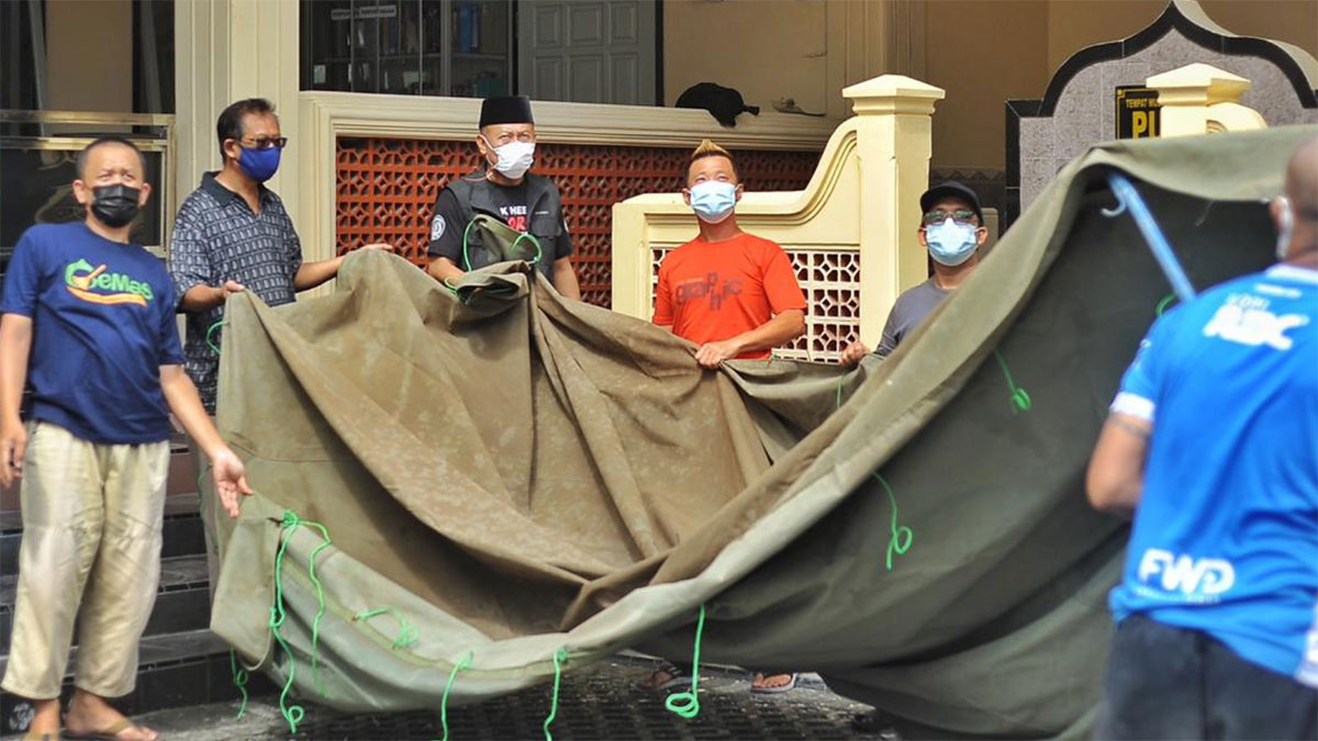 Warya non muslim menyapu, mengepel lantai dan memasang terop. Upaya ini sengaja dilakukan tokoh lintas agama untuk menjaga kerukunan antar umat beragama.