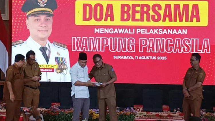 SURABAYA – Pemkot Surabaya menggelar doa bersama sekaligus mengawali pelaksanaan Kampung Pancasila di Balai Kota, Senin (11/8/2025). Doa bersama ini dipimpin langsung Wali Kota Eri Cahyadi dan diikuti seluruh jajaran kepala perangkat daerah (PD), camat, hingga lurah di lingkungan Pemkot Surabaya.