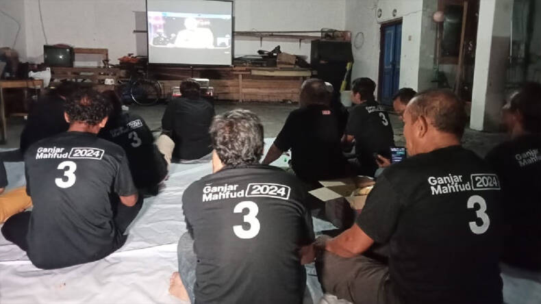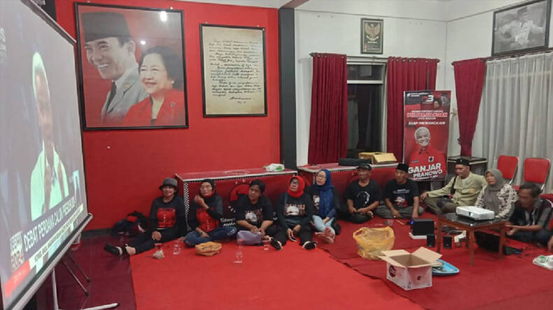 Nobar dihadiri sejumlah calon anggota legislatif partai berlambang kepala banteng, para kader, relawan hingga sejumlah simpatisan pendukung paslon nomor urut 3 Ganjar Pranowo-Mahfud MD.