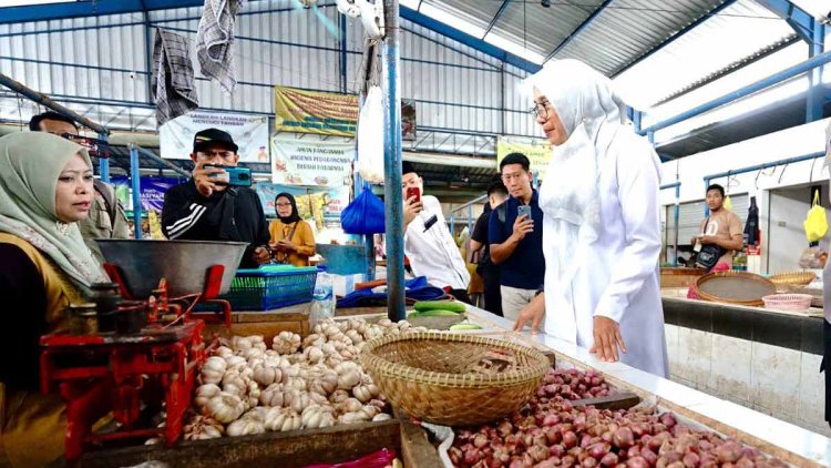 BANYUWANGI – Bupati Banyuwangi, Ipuk Fiestiandani, bersama Forkopimda memantau ketersediaan bahan pokok di Pasar Blambangan, Kamis (6/3/2025). Ipuk memastikan stok dan harga bahan pokok terkendali sehingga inflasi akan terjaga.