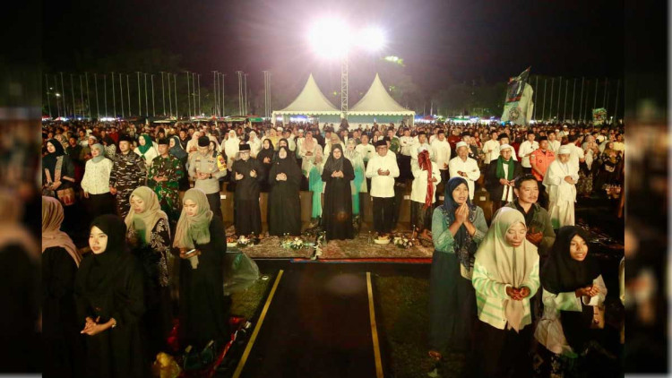 BANYUWANGI – Kabupaten Banyuwangi menutup malam pergantian tahun, Rabu (31/12/2025), dengan muhasabah dan doa bersama di Alun-alun Taman Blambangan. Ribuan jamaah, tokoh agama, kiai dan pejabat daerah larut dalam suasana khusyuk, bermunajat memohon keberkahan untuk Banyuwangi di tahun mendatang.