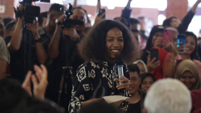 JEPARA – Ada momen heroik saat Ganjar Pranowo menghadiri acara ngopi bareng anak muda di Taman Kopi Mayong, Jepara, Selasa (2/1/2024). Satu dari ratusan pemuda yang datang membacakan puisi ‘Peringatan’ karya Wiji Thukul di hadapan calon presiden (capres) nomor urut 3 itu.