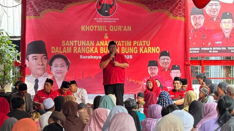 SURABAYA – DPC PDI Perjuangan Surabaya dan Baitul Muslimin Indonesia (Bamusi) Surabaya, menggelar Khotmil Quran dan memberikan santunan kepada anak yatim piatu, dalam rangkaian peringatan Bulan Bung Karno (BBK) 2025.