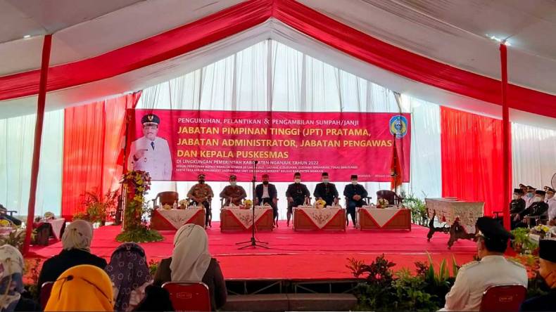 Acara juga dihadiri Ketua DPRD Nganjuk Tatit Heru Tjahjono, Sekretaris Daerah (Sekda) Kabupaten Nganjuk M Yasin, Kepala BKD Adam Muhato, Inspektorat Daerah Kabupaten Nganjuk Ir Fadjar Judiono dan ratusan pejabat peserta pelantikan.