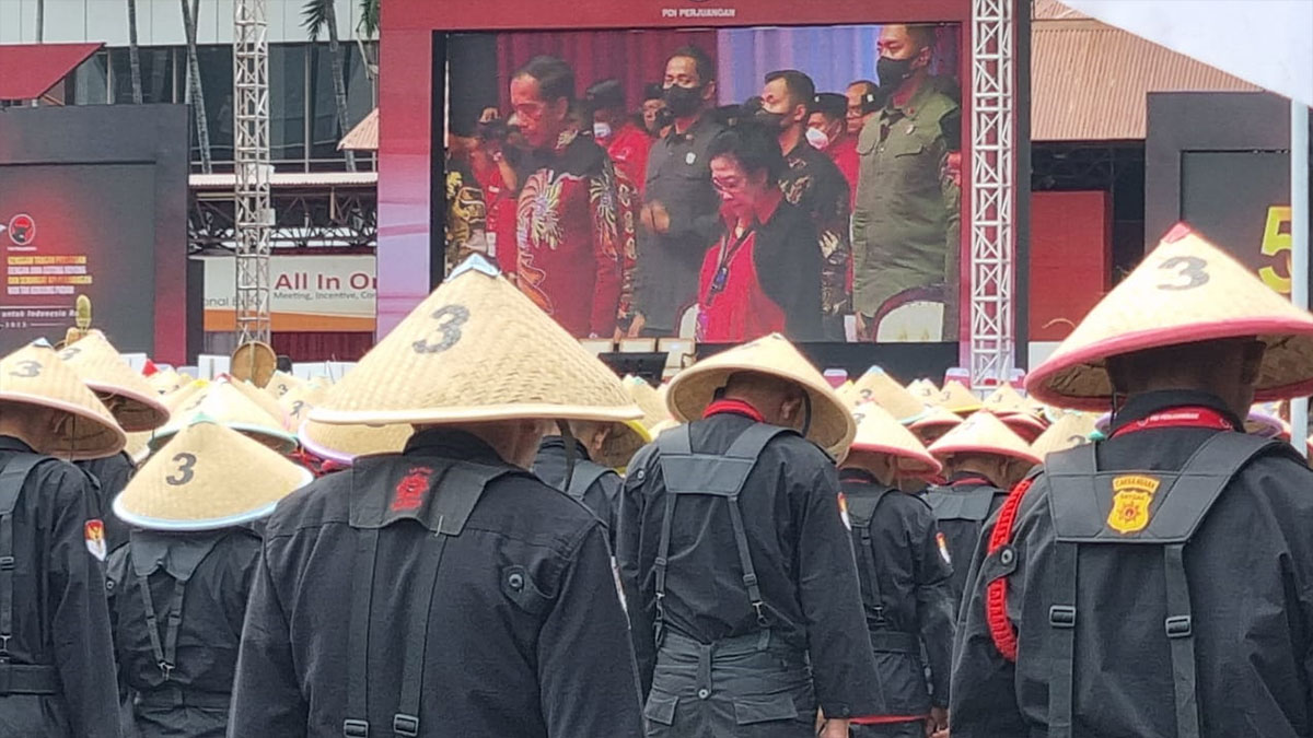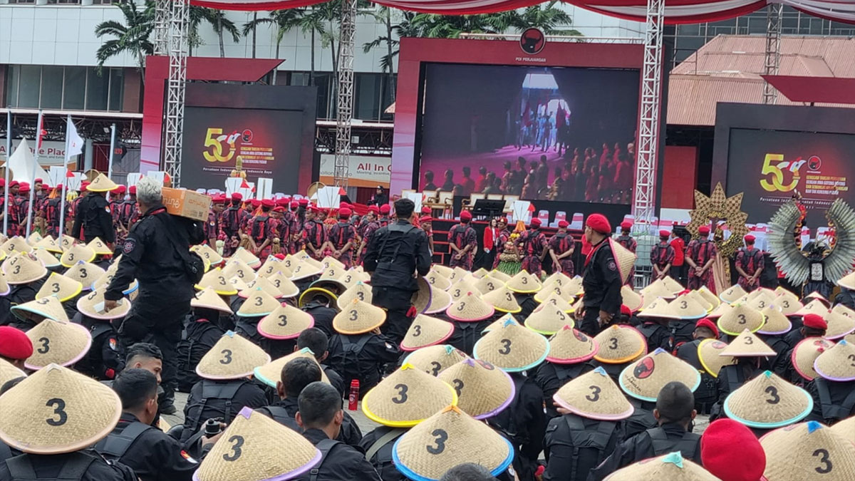 Meski acara utama yang mengawali pembukaan perayaan HUT ke-50 PDI Perjuangan di luar selesai, pasukan pengawal partai berlambang banteng moncong putih ini masih setia duduk mengikuti pidato Ketum dengan raut wajah ceria.