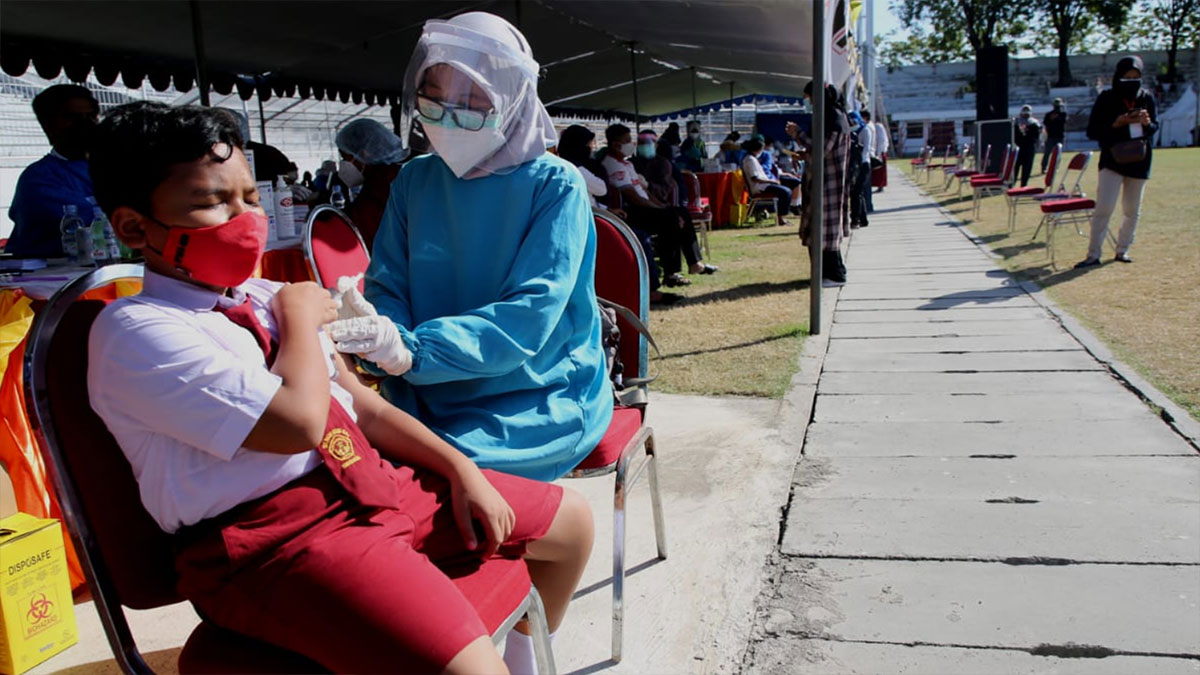 SURABAYA – Pemerintah Kota Surabaya menggelar kegiatan vaksinasi massal khusus untuk pelajar SD-SMP usia 12 tahun di Stadion Gelora 10 Nopember, Tambaksari, Minggu (11/7/2021). Vaksinasi kali ini untuk melindungi anak-anak dari bahaya terinfeksi Covid-19