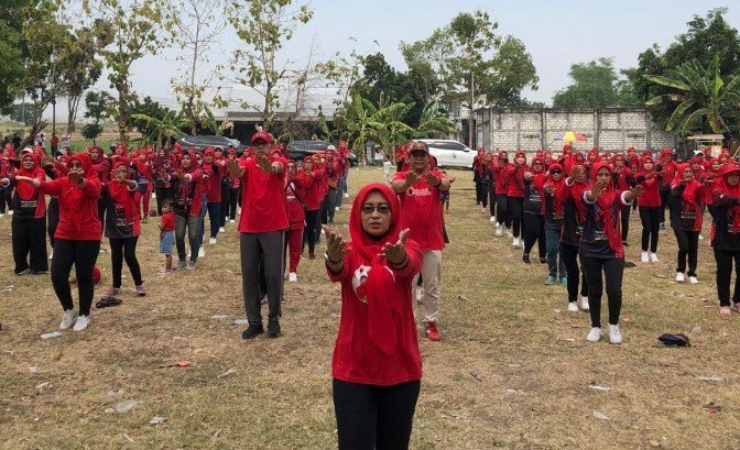 Bendahara DPC PDI Perjuangan, Bambang Sutriyono yang turut mendampingi Teguh, mengajak para ibu pesenam untuk memenangkan pilkada serentak.