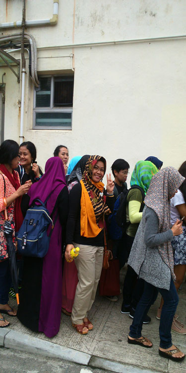 Minggu 23 pagi jam 8 aku sudah keluar rumah, tapi karena ada hal yang harus dikerjakan terlebih dulu, termasuk urusan ngisi perut. Akhirnya perjalanan dimulai pukul 10. Maksud hati sih ingin pagian agar bisa dapat antri depanan, apadaya perut kelaparan, hihi. Setelah Saya menumpang Mass Transit Railway (MTR) dari Saiwanho ke Cousway Bay sekitar 15 menit keluar pintu F, dilanjutkan jalan kaki sekitar 15 menit, sampailah kami (rombongan ketemu di jalan) di tempat yang dituju.