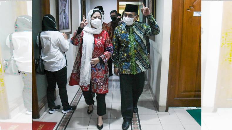 JAKARTA – Ketua DPR RI Puan Maharani bertandang ke kantor Pengurus Besar Nahdlatul Ulama (PBNU), di Jl Kramat Raya, Jakarta Pusat, Selasa (15/3/2022).