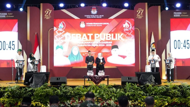 KEDIRI – Debat publik perdana Pilkada Kabupaten Kediri 2024 digelar Komisi Pemilihan Umum (KPU) di Insumo Kediri Convention Centre (IKCC) Kamis (24/10/2024).