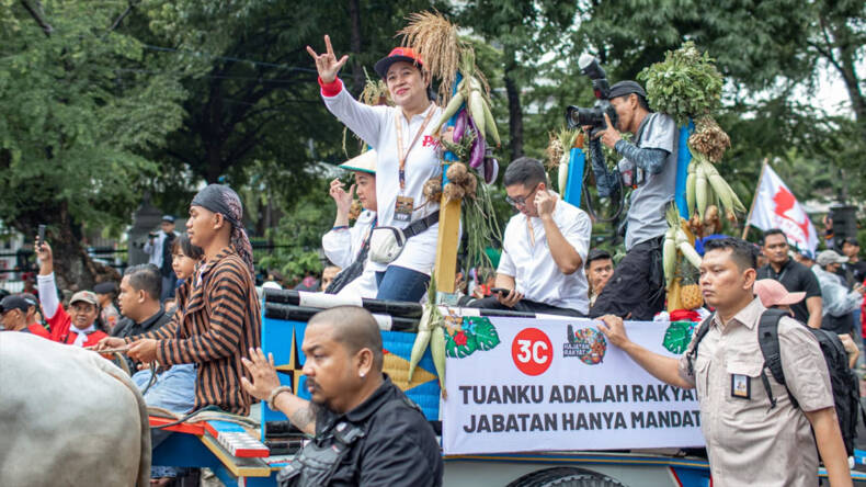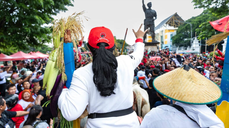 Hajatan Rakyat pendukung Ganjar-Mahfud dimulai sejak pagi hari. Puan turut melakukan kirab dengan gerobak sapi bersama Ganjar dan Mahfud yang didampingi keluarganya masing-masing.