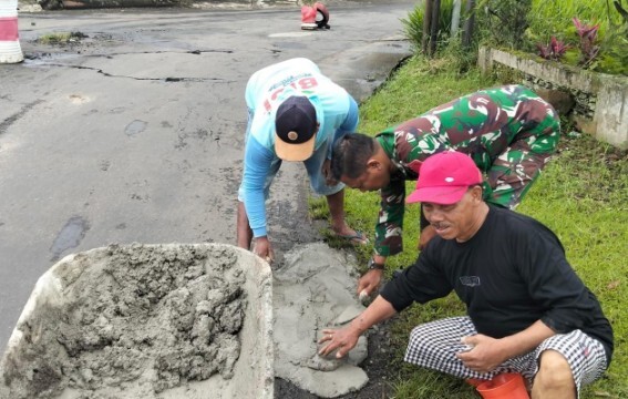 Tanpa instruksi formal yang kaku, mereka berbagi tugas: ada yang mengaduk semen, mengangkut pasir, hingga meratakan material pada lubang-lubang jalan yang menganga.
