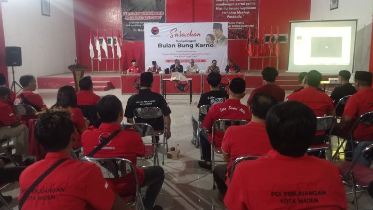 Sarasehan ini oleh jajaran pengurus DPC, PAC, kader hingga simpatisan PDI Perjuangan. Hadir sebagai narasumber Edi Susilo, alumni GMNI dan dosen STKIP Widya Yuwana Madiun, Agustinus Dewantara.