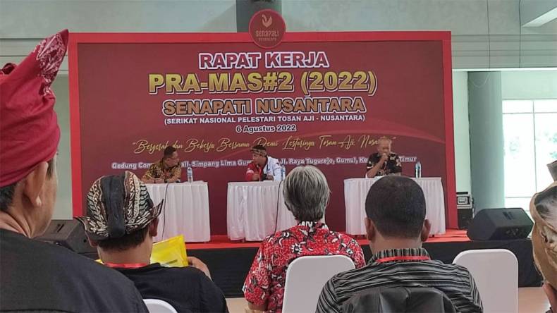 KEDIRI – Serikat Nasional Pelestari Tosan Aji (Senapati) Nusantara menggelar rapat kerja 2022, di Gedung Convention Hall Simpang Lima Gumul (SLG) Kabupaten Kediri, Sabtu (6/8/2022).
