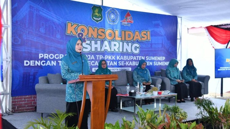 SUMENEP – Ketua Tim Penggerak (TP) PKK Kabupaten Sumenep, Nia Kurnia Fauzi, membuka kegiatan Rapat Konsolidasi dan Sharing Program antara TP PKK kabupaten dan kecamatan se-Kabupaten Sumenep tahun 2025 di Pendopo Kecamatan Kota Sumenep, Kamis (3/7/2025).