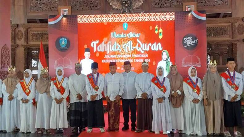PONOROGO – Bupati Ponorogo, Sugiri Sancoko, mewisuda ribuan pelajar hafidz. Mereka adalah pelajar SMP se-Kabupaten Ponorogo yang lulus tahfidz Al-Qur’an hingga 30 juz. Wisuda tersebut digelar di Pendopo Agung Ponorogo, Kamis, (7/3/2024).